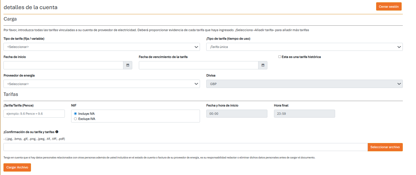 Te llevarán a una nueva pantalla, donde tendrás que introducir la información de tu tarifa