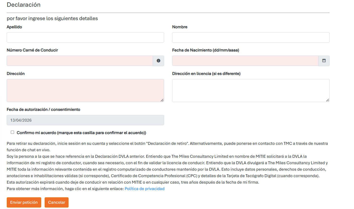 Una vez rellenado, confirma tus acuerdos marcando la casilla y envía tu solicitud.