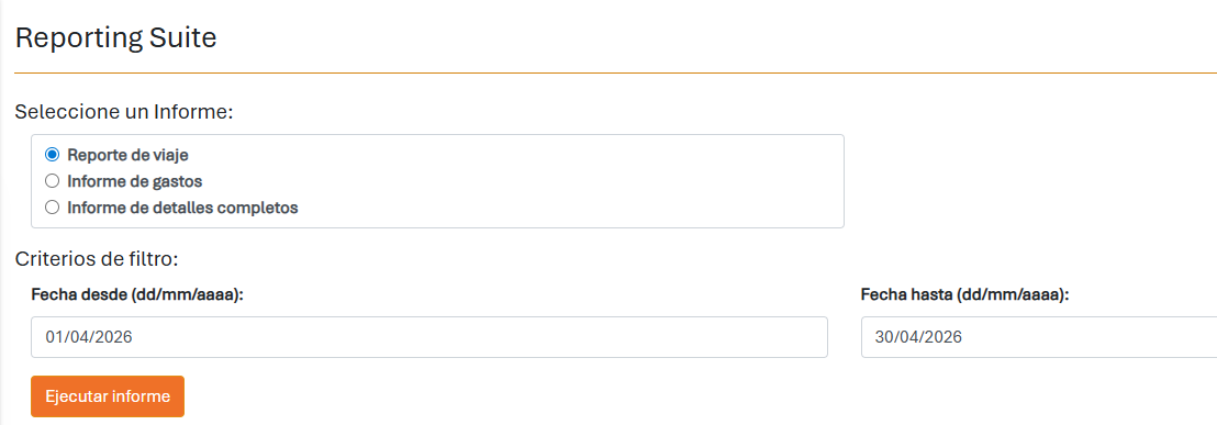 Es posible que tengas que exportar tu informe de viaje para justificar tu solicitud del formulario P87 al final del ejercicio fiscal; en tal caso, modifica las fechas de «Fecha de inicio» y «Fecha de finalización» para que abarquen desde abril hasta abril del ejercicio fiscal anterior.