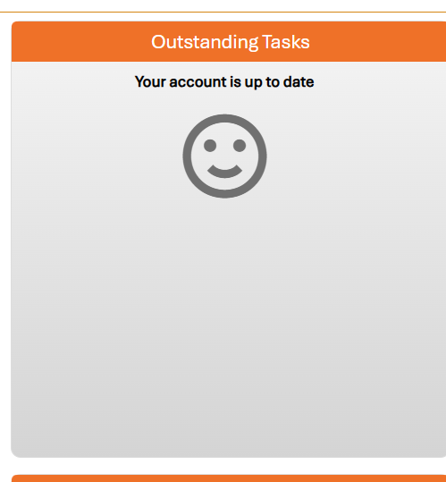 Green- Your outstanding tasks box will display with a smiley face once all tasks are complete. You will be able to access all areas of your account.